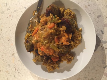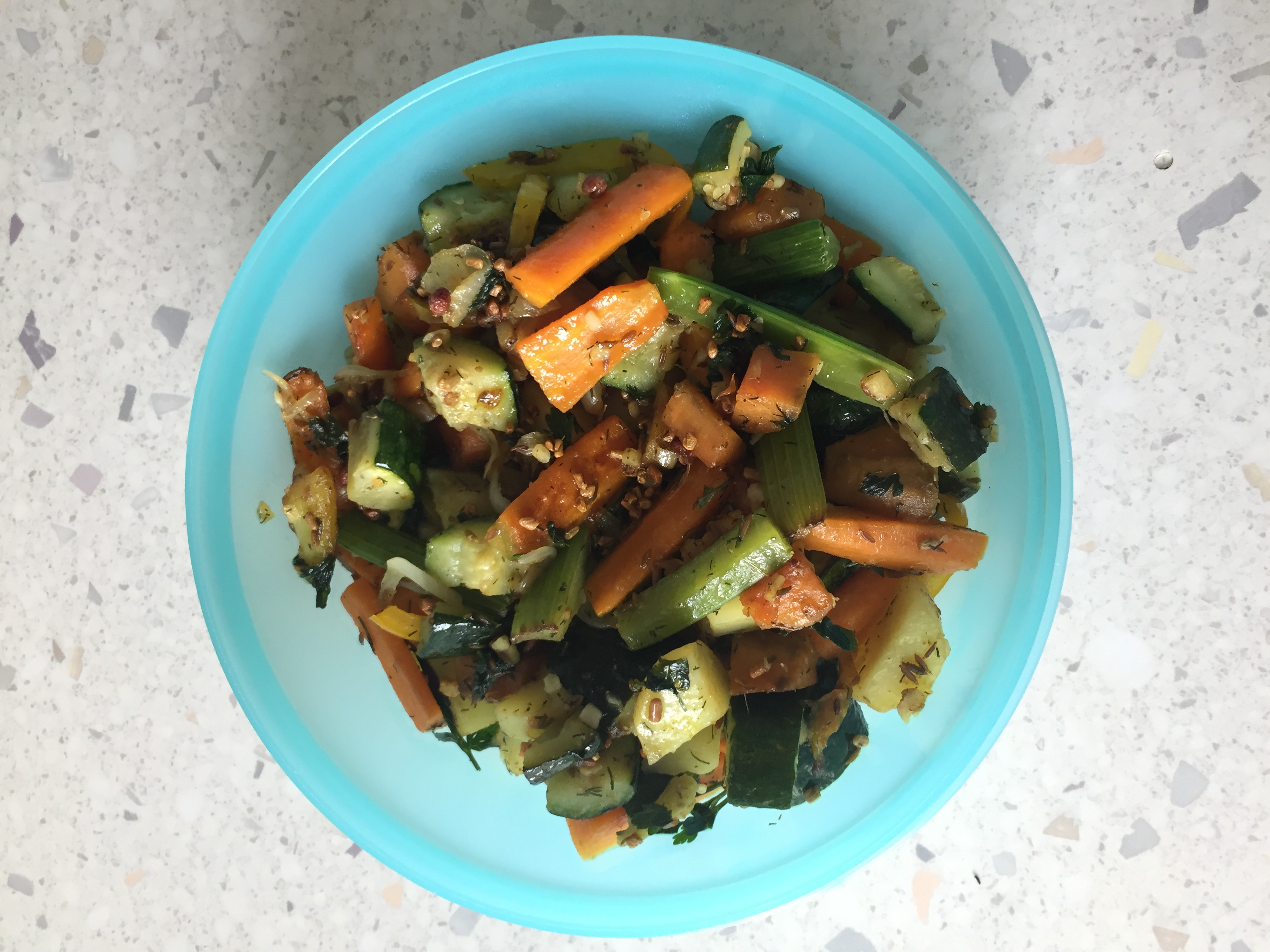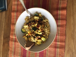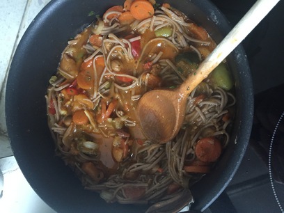 Latest mix of rice noddles, chicken, tofu & zucchini (+ ginger, curcuma, green chilli).