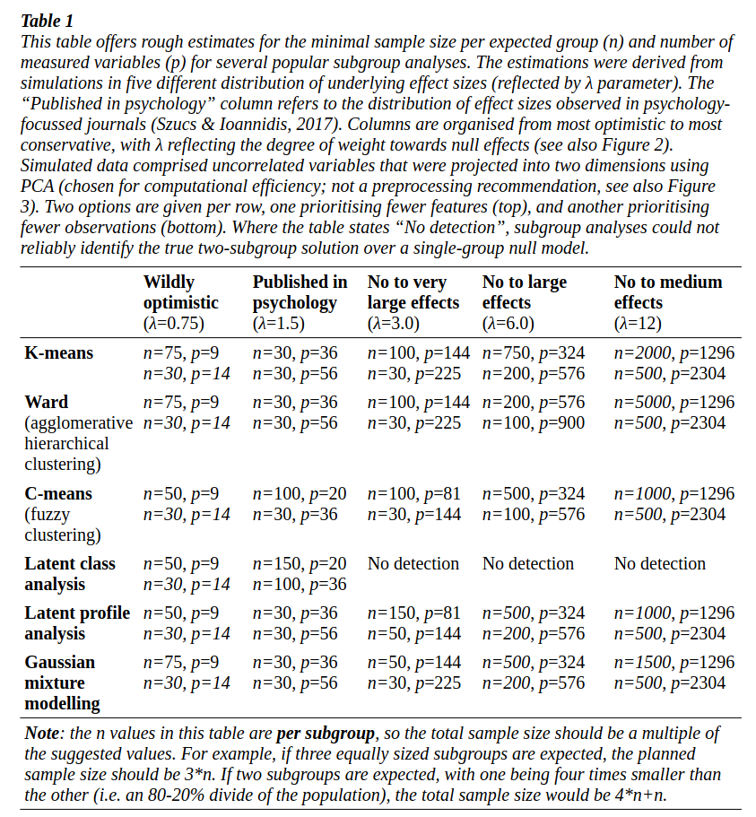This is a short review of power analysis for k-means, Ward agglomerative hierarchical clustering, c-means fuzzy clustering, latent class analysis, latent profile analysis, and Gaussian mixture modelling. Results based on simulated datasets are summarized in Table 1 of the paper, reproduced below.