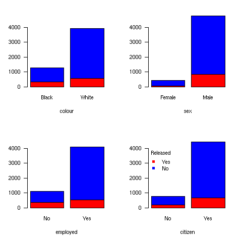 Let’s consider the Arrests data, which is also used in (5) (See also this brief report, and (9), Chap. II.2, p. 57) and aims at studying the probability of release of individuals arrested in Toronto for simple possession of small quantities of marijuana. Characteristics of interest are: race, age, employment, citizenship, previous recording in police databases.