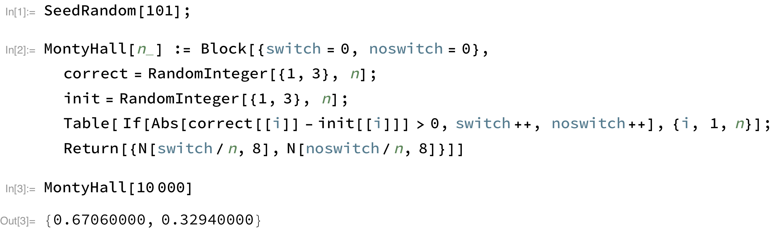 Chapter 1 provides a quick exposition to Bayes theorem, described as a way to get from P(B|A) to P(A|B), especially in cases where P(A|B) is not easy to compute. I find that the M&M problem (§1.6) is a very nice way to introduce bayesian inference, in the spirit of Philip Good’s introduction to permutation testing (Permutation, Parametric, and Bootstrap Tests of Hypotheses, Springer, 2005): define the problem, set up the hypotheses and a test statistic, and finally assess the likelihood of the observed result; or, as the author suggests in Chapter 3: (1) choose a representation for the hypotheses, (2) choose a representation for the data, and (3) write the likelihood function. The next one is about the Monty Hall dilemma and it is really trickier.2 It is, however, easy to run a little simulation of the expected proportion of wins in case we choose to switch or stick to our initial choice. Here are the results I get using Mathematica: