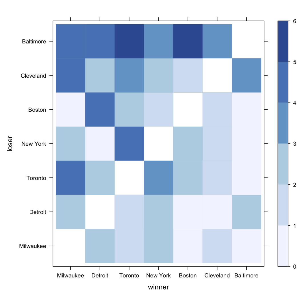 Finally, we might represent the data using a matrix-like representation, where each cell reflect the actual frequency of wins, as suggested below. A more interesting plot would be to show the estimated probability, which is left as an exercise to the reader.