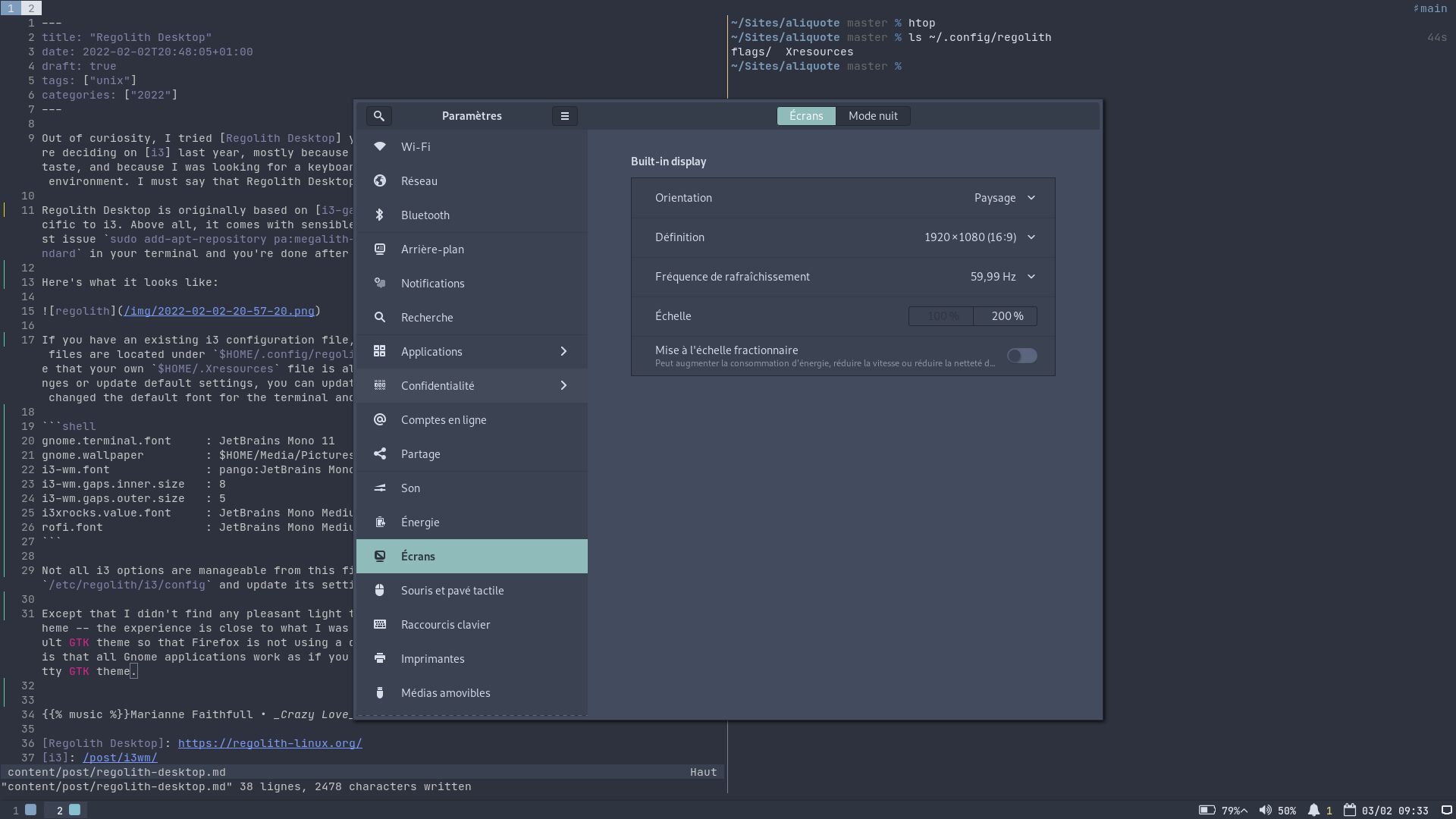 Except that I didn’t find any pleasant light theme for Regolith – I currently use my beloved Nord theme – the experience is close to what I was used to with my own i3 settings. I only tweak the default GTK theme so that Firefox is not using a dark theme as the default. And if I happen to get tired (again) of dark theme for the terminal and my editor, I can still switch back to Kitty since it uses its own color settings. I also disabled a lot of applets for the i3bar.