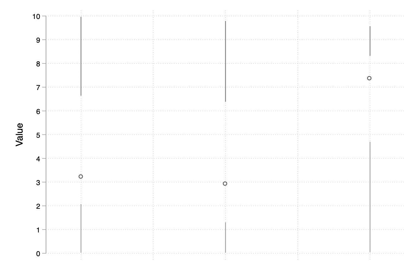 ylab(0(1)10) xscale(r(0.8 3.2)) xlab(1/3, valuelabel noticks) ytitle("Value") xtitle("") legend(off)