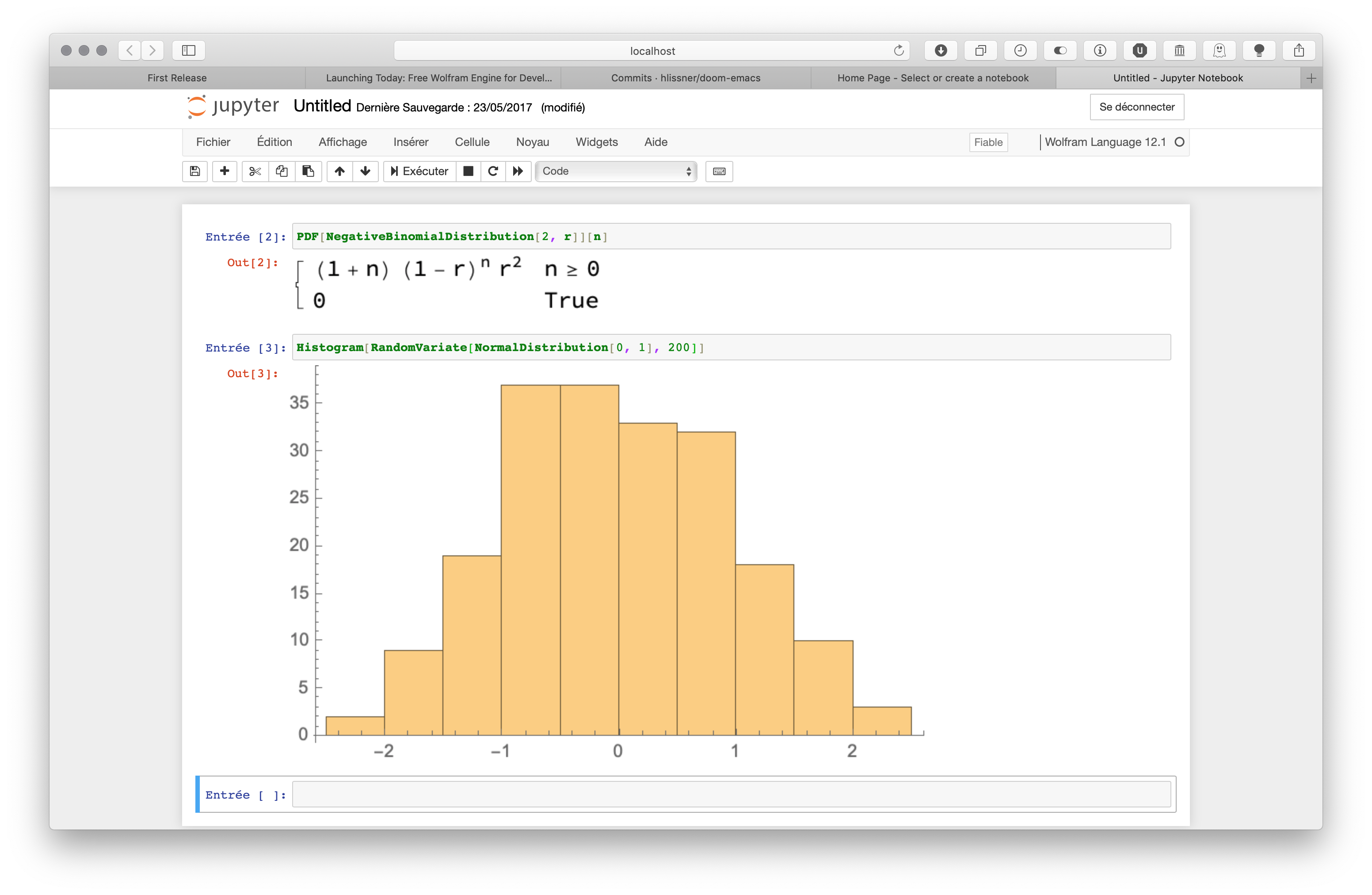 Unfortunately, at this point I do not find the Jupyter UI very interesting compared to, say, Stata or Python. While Stata or Python runs fine in an interactive Qt console, results are also correctly rendered under Emacs, pending a minor issue with graphical output. However, nothing like this is available at the time of this writing for Wolfram code. Moreover, here is what I get when using wolframscript, compared to the output of Mathematica: