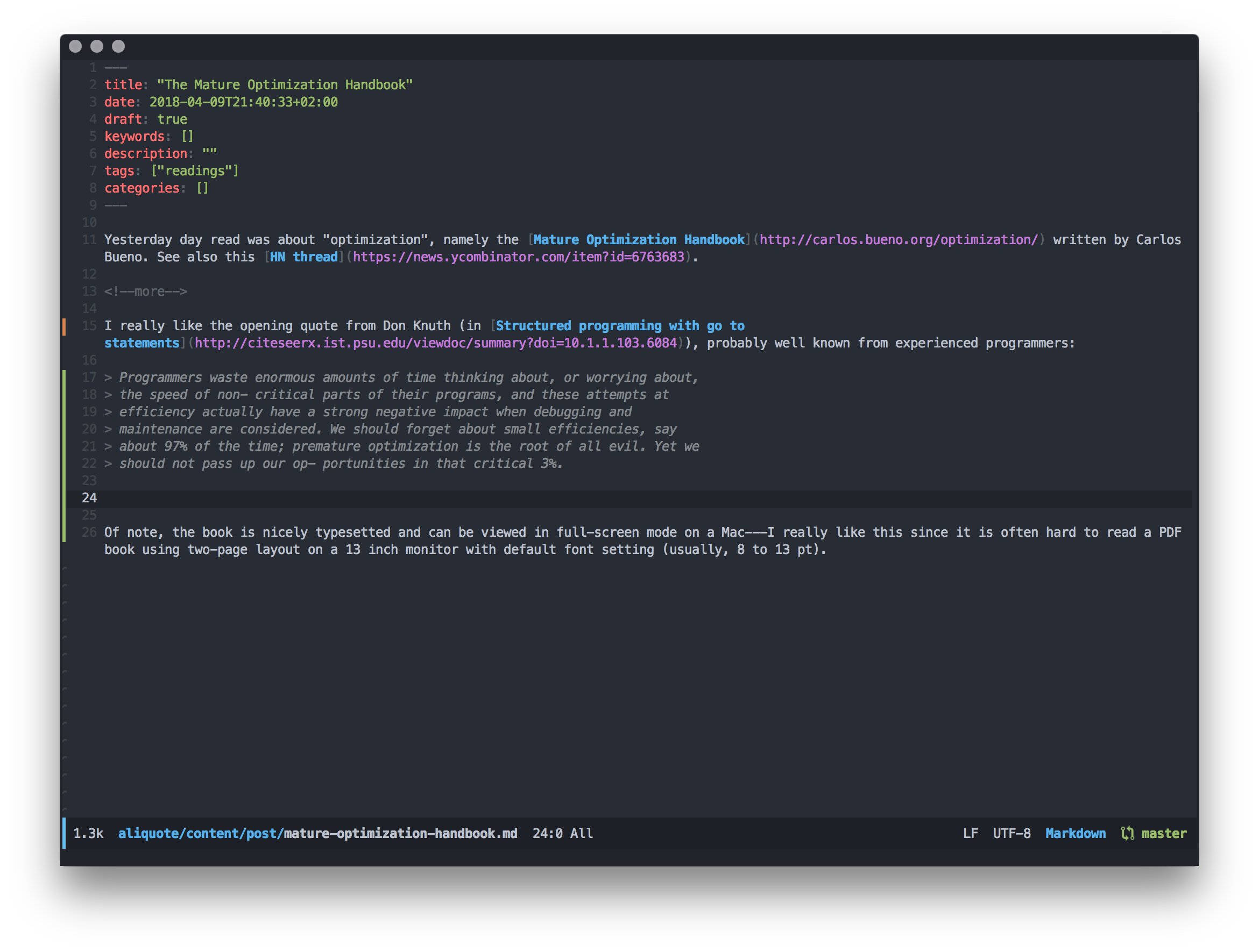After Spacemacs, I am currently experimenting with another variant of an evil-powered Emacs: Doom Emacs. As far as I can tell, it is blazing fast and the default factory settings are well thought.